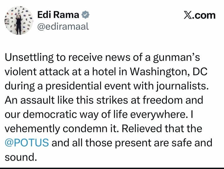 Tiranë – Kryeministri i Shqipërisë, Edi Rama, ka reaguar në platformën X pas incidentit me të shtëna në Uashington, duke e cilësuar atë si një sulm ndaj lirisë dhe demokracisë.